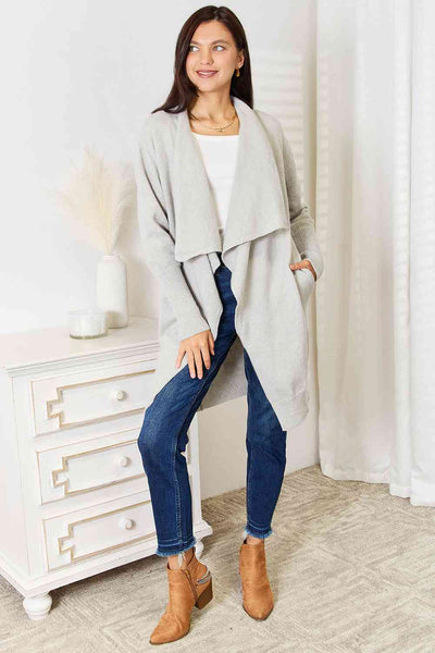 The Front Pocket Duster Cardigan is effortlessly stylish with its cozy design and practical pockets. Its flowy silhouette and soft material make it the perfect addition to any outfit for a comfortable and fashionable look.