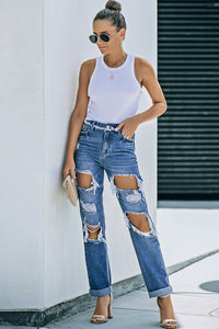 These Distressed Frayed Trim Straight Leg Jeans will give you an effortless, cool look. These jeans are perfect for any occasion and will be your go-to pick for the season.