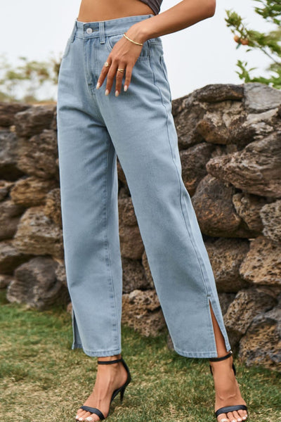 High Waist Loose Fit Ankle Slit Jeans Pants