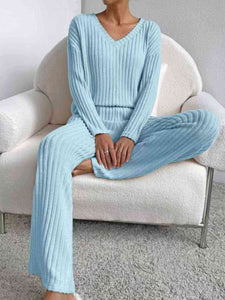 Ribbed V-Neck Long Sleeve Top and Pants Set